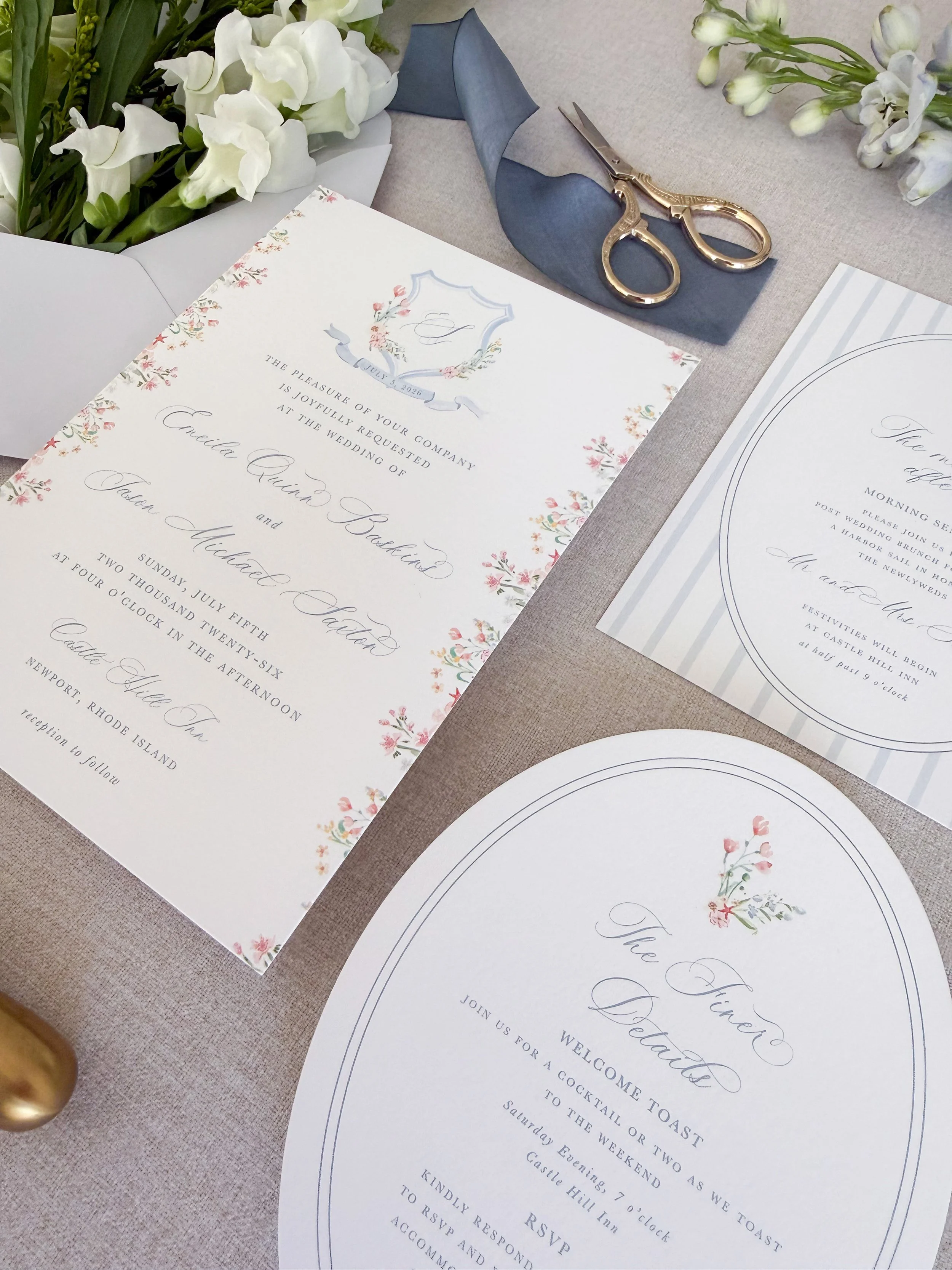 This suite draws inspiration from summer along the Newport shoreline — where tailored details meet garden romance. A delicate monogram crest anchors the design, framed by subtle florals and softened by a muted french blue palette.